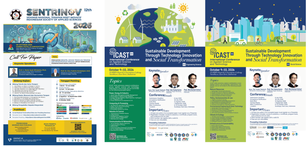 SURABAYA, April 2026 – Indonesian Society of Applied Sciences (ISAS) kembali mempertegas komitmennya dalam memajukan riset terapan di Indonesia dengan menyelenggarakan dua agenda besar pada Oktober 2026: Seminar Nasional SENTRINOV ke-12 dan Konferensi Internasional iCAST ke-9. Rangkaian acara ini menjadi momentum strategis seiring langkah ISAS dalam mendorong transformasi akreditasi berbasis dampak di lingkungan LAM Teknik. […]