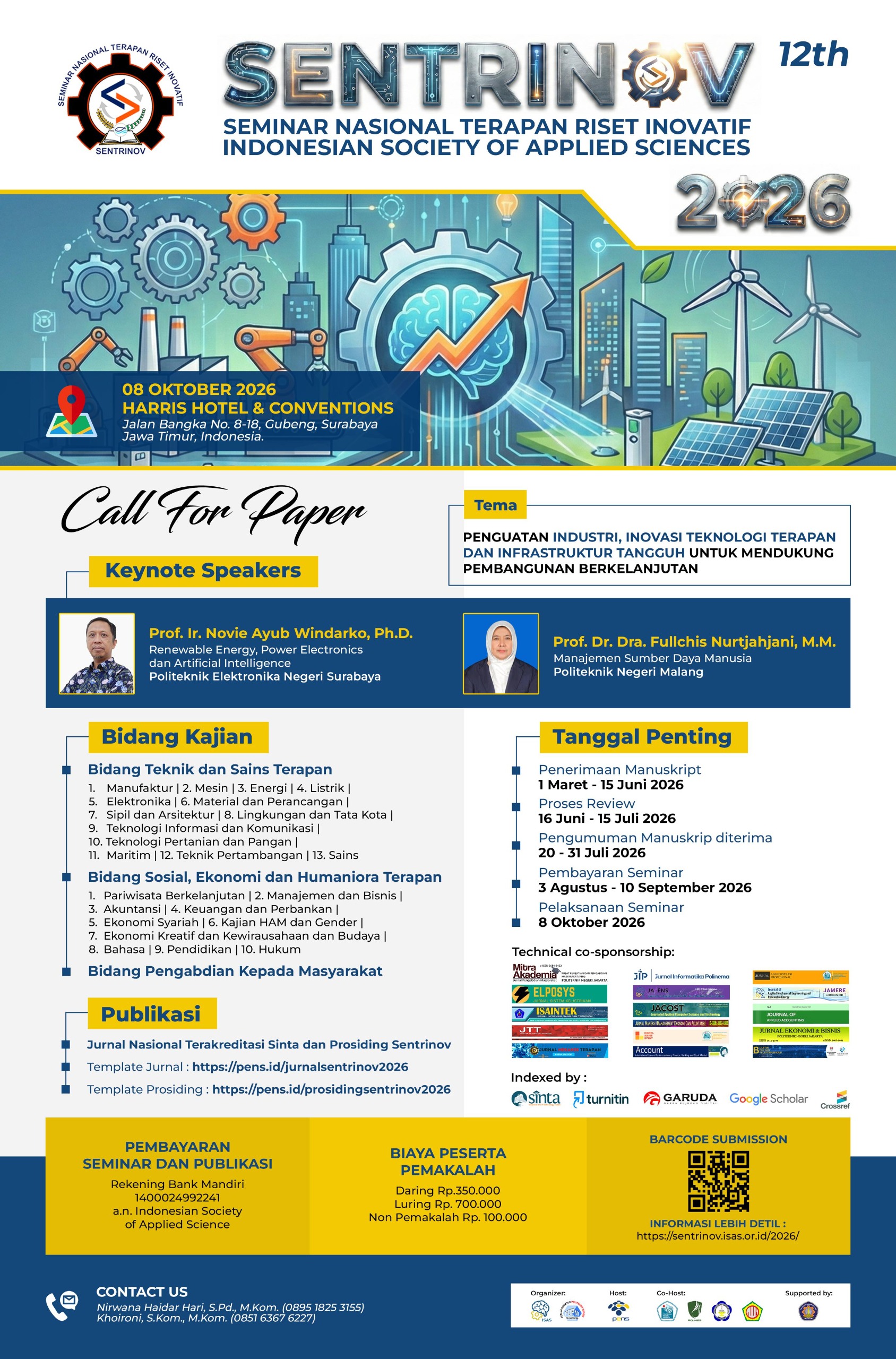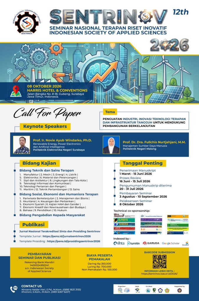 1. SENTRINOV 12th (8 Oktober 2026): Berlokasi di Harris Hotel & Conventions Gubeng, Surabaya. Seminar nasional ini mengusung tema “Penguatan Industri, Inovasi Teknologi Terapan, dan Infrastruktur Tangguh untuk Mendukung Pembangunan Berkelanjutan”. Menghadirkan keynote speakers Prof. Ir. Novie Ayub Windarko, Ph.D. (PENS) dan Prof. Dr. Dra. Fullchis Nurtjahjani, M.M. (Polinema).
