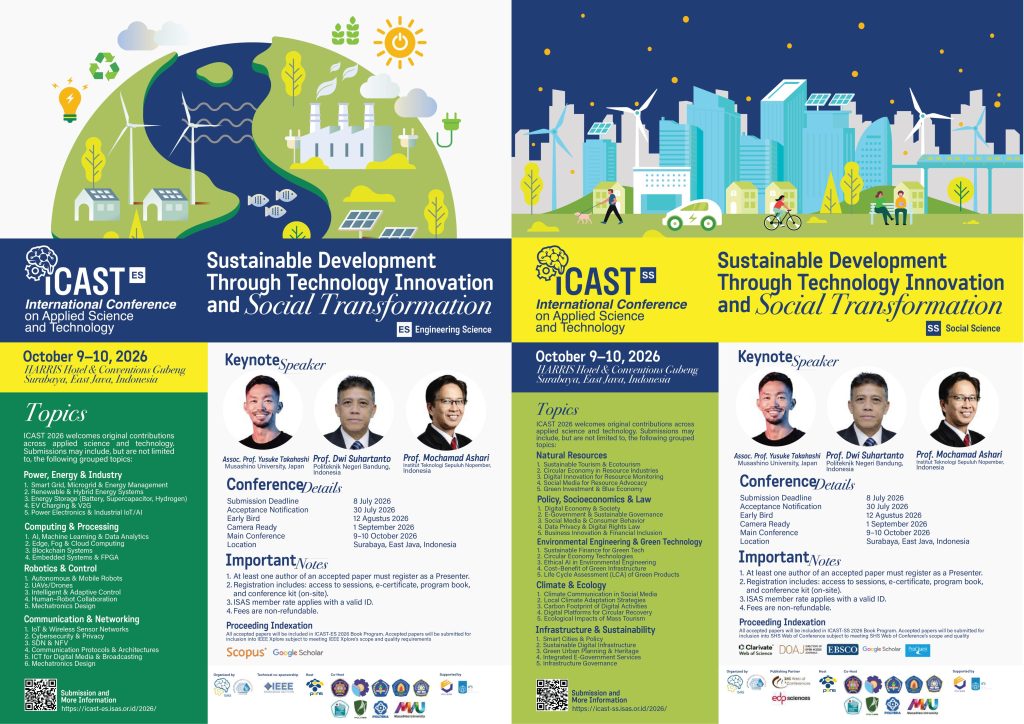 2. iCAST 2026 (9–10 Oktober 2026): Konferensi internasional ini dibagi menjadi dua fokus utama: Engineering Science (ES) dan Social Science (SS). Dengan pembicara dari Jepang dan Indonesia, iCAST menjadi wadah publikasi bereputasi global yang terindeks Scopus dan Web of Science.