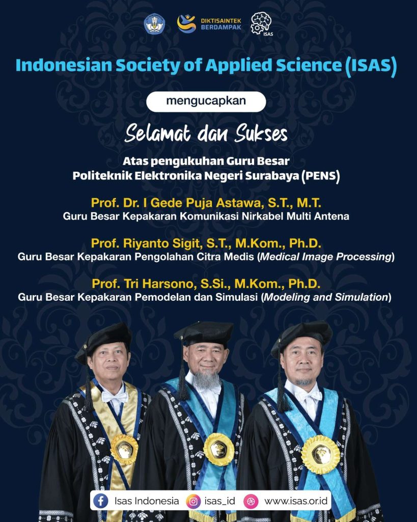 Adapun tiga Guru Besar yang dikukuhkan adalah Prof. Dr. I Gede Puja Astawa, S.T., M.T. sebagai Guru Besar Kepakaran Komunikasi Nirkabel Multi Antena, Prof. Riyanto Sigit, S.T., M.Kom., Ph.D. sebagai Guru Besar Kepakaran Pengolahan Citra Medis (Medical Image Processing), serta Prof. Tri Harsono, S.Si., M.Kom., Ph.D. sebagai Guru Besar Kepakaran Pemodelan dan Simulasi (Modeling and Simulation).